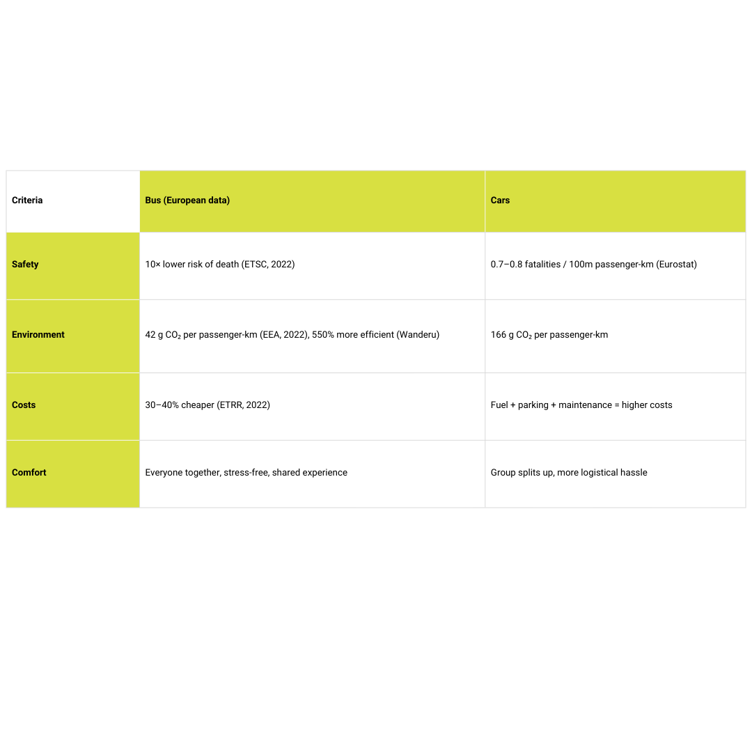 If you are planning a school trip, team outing or a weekend trip with friends, the question arises: go with several cars or hire a bus? At first glance a car seems more flexible, but numbers and studies tell another story — for large groups a bus is safer, more comfortable and certainly more environmentally friendly.
